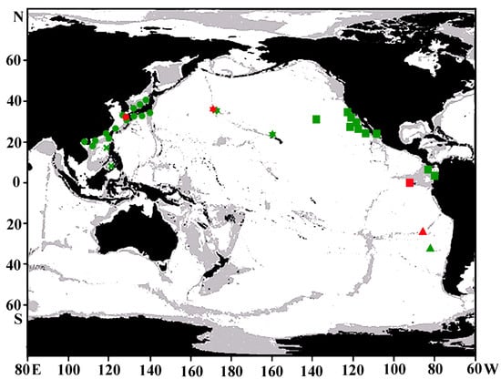 A distribution map of the four morphologically similar Gnathophis species in the Pacific Ocean based on the specimens examined, the literature data [5,19,20,21,22,23], and web database (www.gbif.org/species/2403303 and www.gbif.org/species/102058300, accessed on 7 April 2025): squares, G. cinctus; stars, G. johnsoni sp. nov.; circles, G. heterognathos (× indicates questionable records in [22]); triangles, G. smithi. Red symbols show holotype localities. A single symbol may indicate more than one capture.