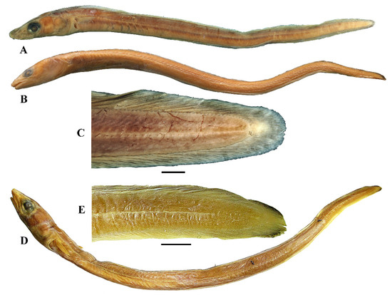 Gnathophis cinctus (A–C) and G. smithi (D,E). (A,B,D) habitus, (C,E) caudal fin; (A,C) SIO 72-203, 305 mm TL; (B) SIO 76-233, 296 mm TL; (D,E) ZMMU P.18045, paratype, 280 mm TL. Scale bars: 5 mm.