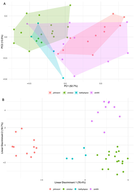 Gnathophis johnsoni sp. nov. also has a higher average count of preanal vertebrae in comparison to G. cinctus (35–38, mean 36 vs. 33–36, mean 34), highly overlapping in this respect with G. bathytopos and G. smithi (34–38). Our analysis shows a wider variation in many measurements (Table 2), disproving the diagnostic value of some of them (e.g., head length, eye diameter, gill slit length, preanal distance) taken from the publications [1,21,33,34]. Only a few measurements do not overlap, allowing for the separation of individual specimens. Gnathophis johnsoni sp. nov. has a longer rictus and a longer caudal fin in comparison with G. cinctus (6.2–7.0 and 1.7–2.3% TL vs. 5.0–6.2 and 1.0–1.6% TL) and a narrower interorbital in relation to TL in comparison with G. bathytopos (1.6–3.6 vs. 1.3–1.6% TL). All other morphometrics overlap (Table 2). The principal component analysis (PCA) of the size-standardized morphometrics revealed a clear separation of Gnathophis johnsoni sp. nov. from G. cinctus and G. bathytopos, with G. smithi overlapping all three other species in morphospace (Figure 4A). The first component (PC1) covered 52.7% of the variation, with the largest contributions regarding the interorbital width, caudal-fin length, interbranchial width, body depth at anus, pectoral-fin base length, upper-jaw length, and snout length, while the second component (PC2) covered 13.5% of the variation, with the largest contributions regarding the distance between lower end of pectoral-fin base and lower end of gill slit, gill slit length, body depth at anus, trunk length, and pectoral-fin base length. The MANOVA test revealed a strong species effect (p < 0.001), indicating significant variation in morphometric traits across the four species. Post hoc ANOVA results showed that PC1 differed significantly among species (p < 0.001), while PC2 did not (p = 0.129). Tukey’s pairwise comparisons identified significant differences in PC1 scores between G. johnsoni sp. nov. and G. cinctus (p < 0.001) and G. bathytopos (p = 0.006), but not G. smithi (p = 0.627), although G. smithi differed significantly from G. cinctus (p = 0.001). No significant pairwise differences were detected for PC2.
