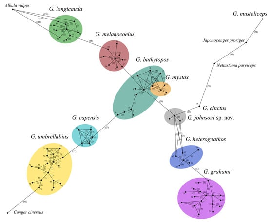 The network was built using a 554 bp fragment to include a larger number of samples available for comparison. To construct the trees, a longer fragment of 582 bp was used, but we had to exclude some too short sequences from the analysis. Due to different fragment lengths, the numbering of haplotypes on the network and trees does not match. Albula vulpes (GU224698), Conger cinereus (KF929775), Japonoconger proriger (MF956464), and Nettastoma parviceps (AP010864) sequences from NCBI database were used as an outgroup. The sequences used for molecular analysis are listed in Table 1.