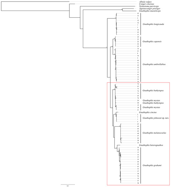 Tree topology reconstruction of specimens of Gnathophis johnsoni sp. nov., its congeners, and outgroup based on the maximum-likelihood method (GTR + G model, rapid bootstrapping, 1000 replicates) for the mitochondrial cytochrome oxidase subunit I (COI) gene. The numbers beside each branch indicate bootstrap values. The numbers to the right of the branches correspond to the number of haplotypes in Table 1. Red frame combines species with elevated lateral-line pores.