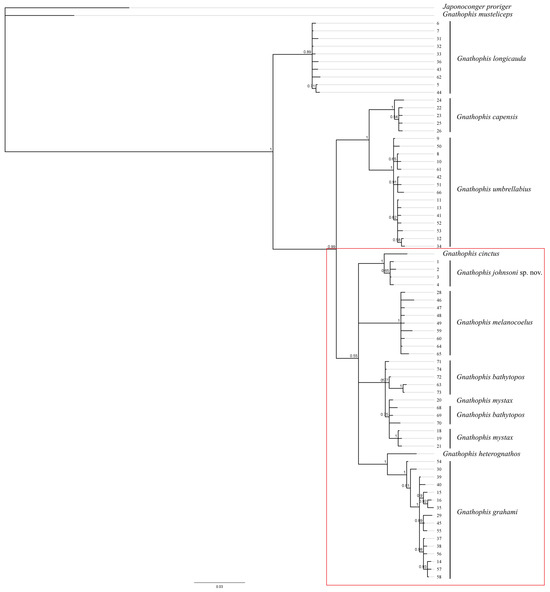 Tree topology reconstruction of specimens of Gnathophis johnsoni sp. nov., its congeners, and outgroup based on Bayesian inference analyses (GTR + G model, 10 million generations, three heated chains, sampling frequency—every 1000 generations, the first 25% of trees was discarded as burnin, and the other parameters were default) for mitochondrial cytochrome oxidase subunit I (COI) gene. The numbers beside each branch indicate posterior probability. The numbers to the right of the branches correspond to the number of haplotypes in Table 1. Red frame combines species with elevated lateral-line pores.