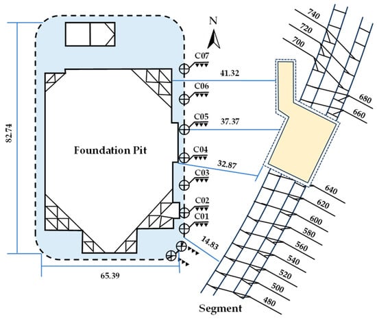 The proposed project involves a foundation pit in Qingdao City. As shown in Figure 2, the shield tunnel is located at the corner of the foundation pit, making its deformation highly susceptible to the spatiotemporal effects of excavation. The pit covers an area of approximately 6204.6 m2, with a depth ranging from 12.5 m to 14 m. Its dimensions are approximately 65 m in the east–west direction and 82 m in the north–south direction. During excavation, unevenly distributed artificial fill layers were encountered, with thicknesses varying between 2.7 m and 5.4 m. These layers primarily consist of construction debris and clay fill materials, characterized by complex composition and high compressibility. Beneath the artificial fill layers lie Quaternary strata and sedimentary layers formed by alluvial and diluvial processes. The geological composition mainly includes silty clay, silty clay interbedded with gravel, and cobble layers.