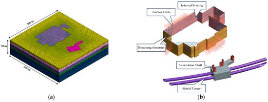 The model establishes a coordinate system with the center of the excavation as the origin. To mitigate boundary effects, the model boundaries were set at 3 to 5 times the excavation width in depth. Considering the relative positional relationships of the tunnel, the X-axis direction was defined as 200 m, the Y-axis direction as 200 m, and the Z-axis direction as 50 m. To simulate potential boundary conditions in actual engineering, horizontal displacement constraints were applied to the lateral sides of the model, vertical constraints to the bottom, and the top boundary was set as free. The mesh generation of the model is illustrated in Figure 3a, with detailed meshing of the shield tunnel and excavation support structures shown in Figure 3b. This meshing approach facilitates precise capture of structural interactions and their mechanical responses under loading.