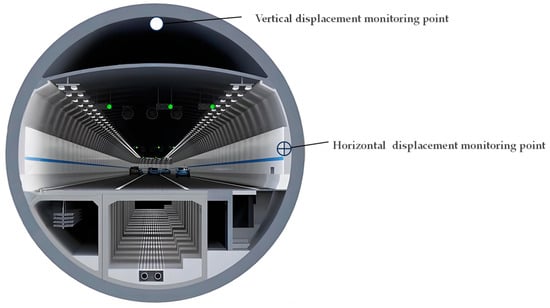 The advantages of the field measurement method lie in its authenticity and reliability. Through actual monitoring, the most accurate field data can be obtained to evaluate the practical impacts of foundation pit excavation on existing tunnels. Based on the affected zone in this project, displacement analysis of shield tunnels during different construction phases was conducted. The configuration of monitoring cross-sections is illustrated in Figure 2. The layout of monitoring points within tunnel cross-sections is shown in Figure 4.