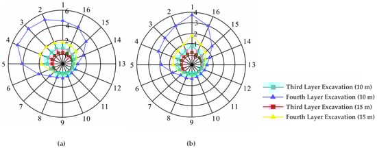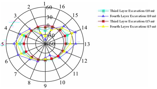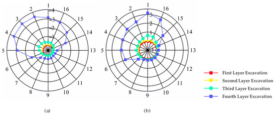 Variation of tunnel displacement for different excavation depths. The radial coordinate denotes displacement; and the circumferential coordinate indicates measurement point ID. (a) Horizontal displacement. (b) Vertical displacement.