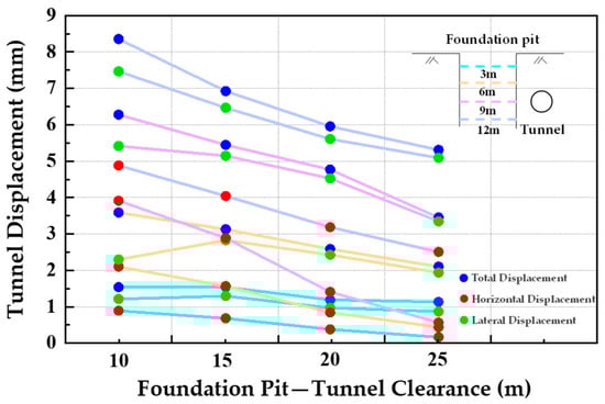 Based on the analysis in Figure 7, it can be observed that as the excavation depth of the foundation pit increases, the horizontal clear distance between the pit and the tunnel also increases, leading to a gradual reduction in both the total and vertical displacements of the tunnel. During the initial stages of excavation (e.g., at depths of 3 m and 6 m), the horizontal displacement of the tunnel initially increased and then gradually decreased with an increase in the horizontal clear distance. Notably, the maximum displacement occurred at a horizontal clear distance of 15 m, after which displacement began to diminish. This phenomenon primarily arises because the increasing horizontal clear distance alters the spatial angle between the tunnel and the excavation center as excavation progresses. These angular changes influence the force distribution and displacement patterns acting on the tunnel, thereby driving the observed displacement trends. In summary, increasing the horizontal clear distance between the foundation pit and the tunnel effectively mitigates displacement during excavation.