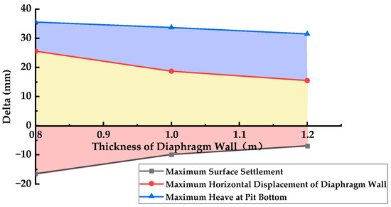 Analysis of the data in Figure 10 shows that when the thickness of the diaphragm wall increases from 0.8 m to 1.2 m, the surface settlement decreases from 16.9 mm to 6.3 mm (a reduction of 62.7%), and the horizontal displacement of the diaphragm wall decreases from 24.7 mm to 14.6 mm (a reduction of 40.9%). This indicates that increasing the thickness of the diaphragm wall significantly enhances the control of foundation pit deformation. However, when comparing the maximum base heave of the foundation pit, it is found that as the diaphragm wall thickness increases, the maximum base heave decreases only slightly from 36.5 mm to 33.2 mm, representing a mere 9% reduction. This suggests that variations in diaphragm wall thickness have limited effectiveness in controlling base heave. This phenomenon may be attributed to the fact that base heave is influenced by other factors, such as soil properties and the support system of the foundation pit, which remained unchanged in this study.