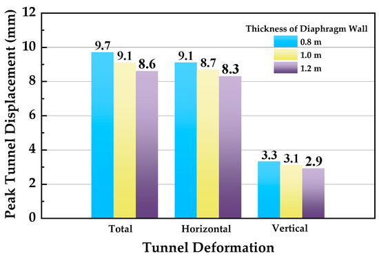 Following the completion of foundation pit excavation, observation of the data in Figure 11 reveals that as the thickness of the diaphragm wall increases from 0.8 m to 1.2 m, the total displacement, horizontal displacement, and vertical displacement of the tunnel all exhibit a downward trend, albeit with relatively minor reductions. Specifically, the total displacement decreases by 12.7%, horizontal displacement by 9.6%, and vertical displacement by 12.1%, none of which represent substantial reductions. This indicates that altering the thickness of the diaphragm wall has limited effectiveness in controlling tunnel displacement deformation.