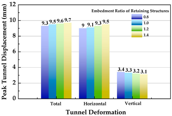 As the embedment ratio of the retaining structure varies, the displacement deformation of the tunnel remains relatively minor (Figure 13). When the embedment ratio increases from 0.8 to 1.4, the total displacement changes by 0.4 mm (a variation magnitude of 4.1%), the horizontal displacement increases by 0.5 mm (4.1%), and the vertical displacement decreases by 0.6 mm (8.8%). These results indicate that altering the embedment ratio of the retaining structure exerts moderate effectiveness in controlling the deformation of adjacent tunnels, yet the overall impact on tunnel displacement mitigation remains limited.