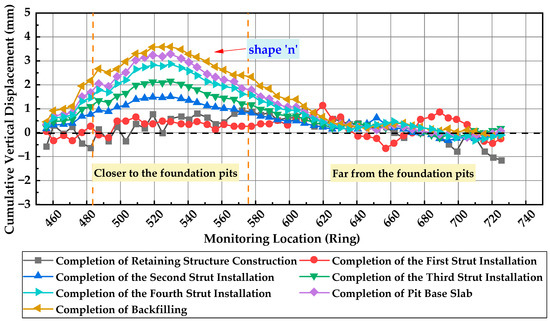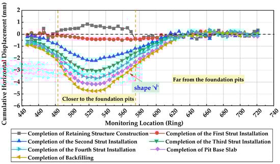 Following the completion of retaining structure construction, tunnel horizontal displacements remained within ±1 mm, indicating negligible deformation. As excavation proceeded, these displacements transitioned from positive to negative values with progressive escalation. This phenomenon is primarily attributed to stress relief in the soil mass due to pit unloading, which reduced lateral earth pressure on the tunnel segment adjacent to the excavation zone, consequently inducing inward deformation toward the pit.