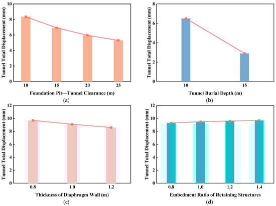 The influences of various factors on total tunnel displacement after foundation pit excavation are illustrated in Figure 17. As shown in the figure, all parameters exert varying degrees of influence on tunnel deformation. The maximum total displacement of shield tunnels progressively decreases with increasing horizontal clear distance between pit and tunnel, while simultaneously demonstrating a decreasing trend with greater tunnel burial depth. Regarding the pit’s retaining system, adjusting diaphragm wall thickness and embedment ratio can partially mitigate the maximum tunnel displacement. However, the mitigation extent remains limited. Practical engineering should adopt holistic consideration of tunnel displacement thresholds and economic factors when selecting parameters. Due to experimental constraints, this study primarily investigated deformation patterns of adjacent shield tunnels in coastal silty clay through numerical simulations, with more comprehensive multivariate analysis and field validation requiring further research.