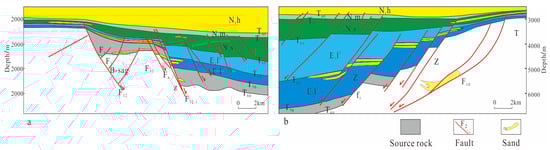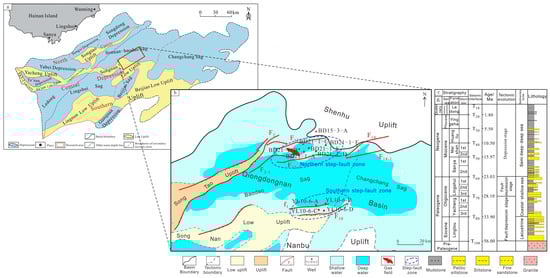 The Baodao sag, located in the north of the Qiongdongnan Basin, is a passive continental margin extensional basin characterized by a graben feature with north–south double faults [18] (Figure 1a,b). The Cenozoic strata deposited in the Baodao sag from bottom to top are the Lingtou Formation (E2l) (T100–T80) of the Eocene; the Yacheng Formation (E3y) (T80–T70) and Lingshui Formation (E3l) (T70–T60) of the Oligocene; the Sanya Formation (N1s) (T60–T50), Meishan Formation (N1m) (T50–T40), and Huangliu Formation (N1h) (T40–T30) of the Miocene; the Yinggehai Formation (N1y) (T30–T20) of the Upper Miocene; and the Ledong Formation (T20–T10) of the Holocene Neogene (Figure 1b) [24]. The semi-enclosed marine mudstone and coal-bearing source rock layers of the Yacheng Formation are the main source rocks in the study area, while the lacustrine mudstone of the Lingtou Formation of the Eocene is a potential source rock [25,26,27].