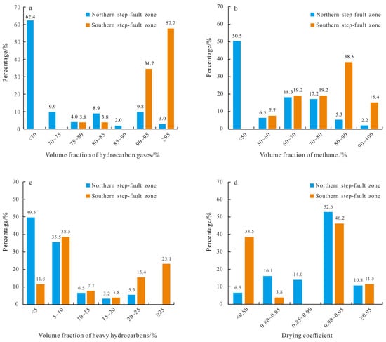 The average densities of natural gas in the Paleogene of the northern and southern fault-step zones of the Baodao sag are 0.872 kg/m3 and 0.762 kg/m3, respectively, showing a gradual decrease in relative density from north to south. In the northern fault-step zone, the hydrocarbon gas volume fraction in natural gas is generally less than 70% (Figure 2a), with methane (CH4) volume fractions mainly ranging from 27.28% to 72.54% (Figure 2b). The heavy hydrocarbon (C2+) volume fraction is small, typically below 10% (Figure 2c), and over 60% of the samples have a dryness coefficient greater than 0.90 (Figure 2d), indicating a predominance of high-maturity dry gas. The volume fraction of CH4 in the northern fault zone is small, but the drying coefficient is high, which is due to the high volume fraction of the non-hydrocarbon gases. The volume fraction of the hydrocarbon gases in the southern fault zone is absolutely dominant, mainly concentrated between 90.47% and 99.17% (Figure 2a), and the CH4 volume fractions are high, ranging from 72.89% to 90.00% (Figure 2b). The volume fraction of the C2+ component is significantly higher than that of the northern fault zone (Figure 2c). The natural gas dryness coefficients are mainly distributed in two intervals, as follows: less than 0.80 and between 0.90 and 0.95, indicating a mixture of dry and wet gases in the southern fault-step zone (Figure 2d).