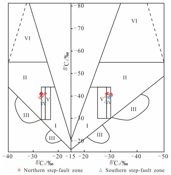 The methane carbon isotope (δ13C1) values in the study area range from −41.1‰ to −37.45‰ (Table 1), with an average of −39.97‰. In the northern fault-step zone, the minimum value of δ13C1 was found in Well BD21-1-F, and the maximum value in Well BD21-1-B. Compared to the northern fault-step zone, the southern fault-step zone has higher δ13C1 values for natural gas, with an average of −39.14‰. The ethane carbon isotope (δ13C2) values range from −30.42‰ to −28.18‰, with an average of −29.4‰, and the minimum value was found in Well BD21-1-B in the northern fault-step zone. The averages for the northern and southern fault-step zones are −29.48‰ and −29.24‰, respectively. The propane carbon isotope (δ13C3) values show little variation, ranging from −27.62‰ to −25.82‰, with an average of −26.92‰. The butane carbon isotope (δ13C4) values vary between −26.39‰ and −24.96‰, with an average of −25.71‰. The carbon isotope values of deep natural gas in the north and south fault-step zones of the Baodao sag are overall low and exhibit the characteristic trend of δ13C1 < δ13C2 < δ13C3 < δ13C4. There are slight differences in the carbon isotopes between the north and south fault-step zones, with heavier carbon isotopes being found in the natural gas of the southern fault-step zone. The carbon isotope characteristics of natural gas in both zones indicate contributions from sapropelic organic matter [38].