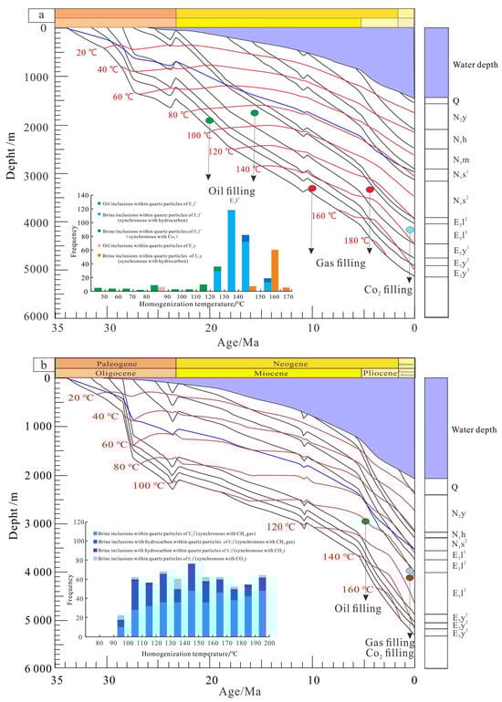 In the southern step-fault zone, the E3l3 reservoir of Well YL10-6-D contains quartz-grain-hosted oil inclusions with blue fluorescence, CH4 gas inclusions, and CO2-bearing brine inclusions. A contemporaneous saline fluid package with blue, fluorescent oil was not detected. Based on the homogenization temperature data of the fluid inclusions, the histogram of fluid inclusions in the E3l3 shows that the temperature of the water inclusions during the same period as the CO2 inclusions ranges from 97.9 to 193.1 °C, and the uniform temperature of its main peak ranges from 132.3 to 139.3 °C (Figure 4b). The homogenization temperatures of the brine inclusions contemporaneous with the CH4 gas inclusions have a wide distribution range, ranging from 92.3 to 195.4 °C, with a peak temperature between 140.2 and 149.6 °C. At least two stages of charging exist in the E3l3 of Well YL10-6-D, including natural gas charging and CO2 charging. The peak homogenization temperatures are significantly higher than the stratigraphic temperatures during the geological history. CO2, as an acidic gas, is a common component in hydrothermal fluids and is speculated to be caused by hydrothermal activity. Based on the analysis of the burial history map of Well YL10-6-D (Figure 4b), there are three stages of oil and gas injection in the YL10-6 block, as follows: oil injection in the Pliocene (5.0 Ma), as well as current natural gas injection and CO2 injection.