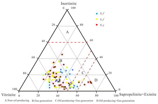 Hydrocarbon source rock evaluation is a crucial aspect of petroleum system research [43,44]. The BD21-1 block in the northern step-fault zone of the Baodao sag is surrounded by the following three hydrocarbon-generating depressions: A sub-sag, B sub-sag, and C sub-sag (Figure 5). These sub-sags possess high organic matter abundance and thick hydrocarbon source rocks, which are key to hydrocarbon accumulation. Kerogen microscopy analysis reveals that the hydrocarbon source rocks in the Baodao sag have a significant proportion of vitrinite, with organic matter types mainly ranging from II2 to III, and a relatively large proportion of Type-III kerogen, which is primarily associated with gas and gas–oil generation (Figure 6). According to the pyrolysis data of hydrocarbon source rocks collected from CNOOC (China) Limited Hainan Branch [42], the black-gray mudstones developed in the E3y have a value ranging from 0.66% to 1.11%, with an average of 0.82%, and a w (S1 + S2) ranging from 0.61 to 4.46 mg/g, with an average of 3.04 mg/g. These mudstones are considered moderately good to good hydrocarbon source rocks. The thickness of the hydrocarbon source rocks in this formation is significant, especially within sub-sag C in the southern part of the BD21-1 block, where the thickness is mainly 600 to 800 m, reaching up to 900 m. This provides a high-quality material foundation for the formation of the BD21-1 gas field. Compared to the northern step-fault zone, the YL10-6 block in the southern step-fault zone has only one hydrocarbon-generating sub-sag, with a w (TOC) value ranging from 0.44% to 1.13%, averaging 0.71%, and a w (S1 + S2) ranging from 0.75 to 3.59 mg/g, averaging 2.08 mg/g, which is considered moderately good. The thickness of the hydrocarbon source rocks in the E3y is mainly between 500 and 700 m. Overall, the BD21-1 block in the northern step-fault zone has more hydrocarbon-generating depressions, which are more conducive to oil and gas enrichment and accumulation.