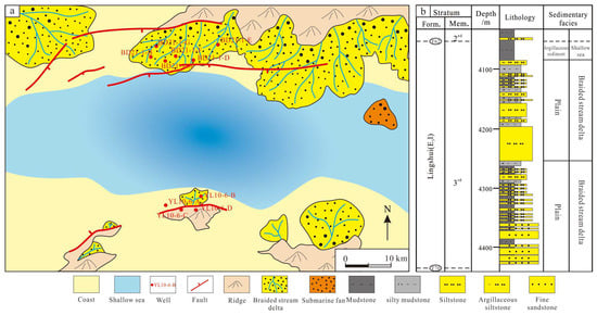 The deep-water area of the Baodao sag is characterized by the development of submarine fans. During the deposition of the upper Oligocene Lingshui Formation, the sediment sources of the Baodao sag mainly originated from the Shenhu uplift in the northeast. With rapid basin subsidence and seawater intrusion, coastal-shallow marine deposition dominated. The E3l3 is in a period of fault–depression transition, with rising sea levels and the extensive development of shallow sea areas. Multiple braided river deltas develop in the catchment areas between faults, which are continuously distributed in the north (Figure 7). The lithology is mainly interbedded with gray, medium-coarse sandstone and gray mudstone. In addition, the existing oil and gas flow wells and oil and gas display reveal that the reservoir layer of the Baodao sag is mainly the third member of the Lingshui Formation of the Upper Miocene, and the type of rock is mainly sandy rock. The reservoirs of the E3l3 are dominated by feldspathic quartz coarse-to-medium sandstones. The clastic particles are mainly medium-grained, with some coarse grains. The sorting is moderate to good, and the rounding is sub-angular to sub-rounded. The particles are mainly supported by granular contacts, with line–point contacts, developed feldspar dissolution pores, and poorly developed cementation, which result in good pore connectivity.