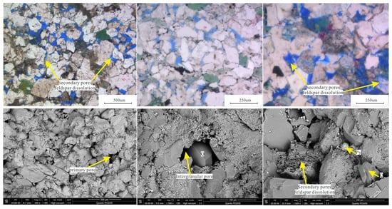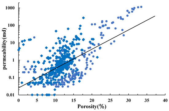 The reservoir space is divided into primary and secondary pores. The primary pores in the Lingshui Formation account for about 52.78%, with a maximum of 58.12%. The intergranular pores are triangular, quadrangular, etc., with varying pore diameters and a face porosity of 7.69%. The compaction effect is strong, with only a small amount of residual intergranular pores and secondary growth karst pores being visible (Figure 8), while the overall porosity of the reservoir is poor. The measured permeability of most samples is between 0.1 × 10−3 µm2 and 10 × 10−3 µm2, and the porosity is between 0 and 20% (Figure 9), which indicates a medium-porosity and low-permeability reservoir. The sand of the braided river delta in the research area is mainly distributed around the fault of F12 and F12-1, providing excellent storage sites for oil and gas. Under high-pressure conditions in deep-water areas, the continuous sand bodies and thick layers of medium-low porosity and medium-low permeability reservoirs formed by the braided river delta can achieve high productivity [45].