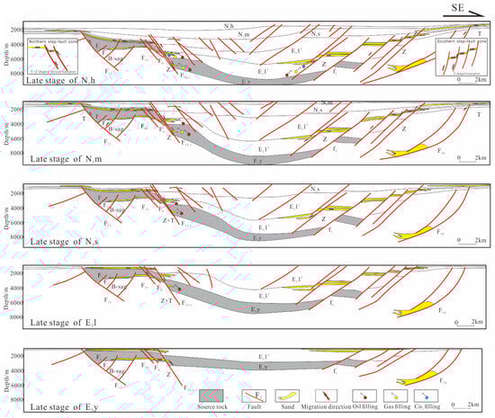 In the YL10-6 block of the southern step-fault zone, vertical migration was mainly controlled by F10-1 and F1 in the north in the early stage, supplemented by lateral migration through the sand. The traps formed at the end of the Lingshui Formation were finalized at the end of the Sanya Formation. Later, the Dongsha movement and Neotectonic movements caused local tectonic stress changes in the faults controlling the traps. Due to the compressive stress formed by the local strike–slip faults, small, compressional anticline traps formed along F10-1 in the south. With two main hydrocarbon charging events, it belongs to multiple stages of reservoir formation. Therefore, the southern fault terrace exhibits a model of reservoir formation, as follows: “mixed hydrocarbon sources—large faults controlling continuous vertical migration—short lateral sand body convergence (Z-type migration)—multiple seal layers” (Figure 12).
