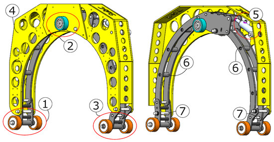 To perform lateral movement, a common approach is to utilize two clamps, one on each end of the robot. The clamps can individually attach and detach from each end, always ensuring one has a connection to the member. The clamp that is detached is moved toward the other by using actuators connecting the two clamps [19,20]. As radial movement around the member or cables is limited, most designs ignore slip. Instead, they rely on over-dimensioning the amount of normal force on the rollers such that enough traction is available [20].