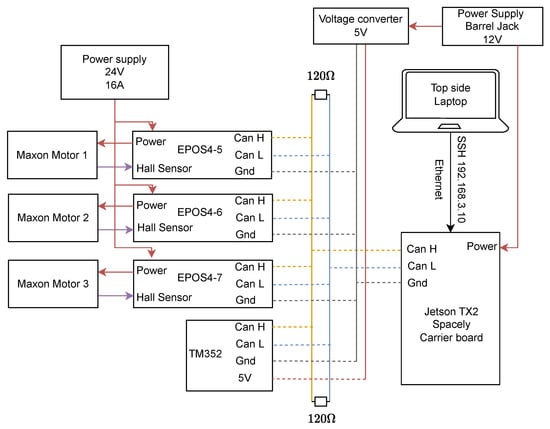 An overview of the connections between the various hardware components can be seen in Figure 3. The top side laptop communicates over Secure Shell (SSH) to the Jetson, which controls the crawler. From the CAN Bus, it receives and delivers the topics through the ROS to the IMU and EPOS4. The EPOS4 and IMU have their unique node ids 5–7 and 120, and the EPOS4 provides the required current to the respective motors. The crawler motors are powered through a 24 V 16 A power supply, with the Jetson from a 12 V barrel jack, which is transformed to 5 V to power the IMU.