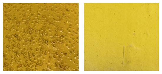 The crawler is designed to operate on a circular member with a diameter of 1.08 m. However, the mechanical structure allows for adaptation to pipes of other diameters, and since the wheel–surface interaction remains the same, the proposed method is expected to generalize with only minor model adjustments. The crawler is tested on a 1.6 m long section of a member. The member consists of two different surfaces: a smooth and a rough surface. Both are painted with a commonly used paint for offshore structures; for the rough surface, sand grains of approximately 2.5 ± 0.5 mm in diameter are inserted with 400 grains covering a surface of 0.1 m2. The member is certified by Det Norske Veritas (DNV) for performing standardized tests of the crawler. An illustration of the surfaces is seen in Figure 4. The smooth surface would be a typically cleaned offshore member, whereas the rough surface is made to emulate the effect of mussels and barnacles attached to the member as well as rust.