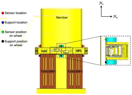 The test member is also used to determine the normal force distributed through the wheel pairs. This is performed using C8C and C9C load cells (HBM, London, UK) that are calibrated and measured through a spider 8. The crawler is supported to counteract the effects of gravity. The test setup is depicted in Figure 6.