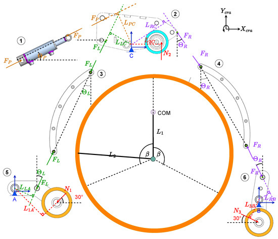 Free-body diagram of the crawler attached to a member seen from the side. The force balance of the crawler is divided into six sections: (1) input piston force, (2) wheel 2 section, (3) left moment arm, (4) right moment arm, (5) left claw and wheel 1 section, and (6) right claw and wheel 3 section.