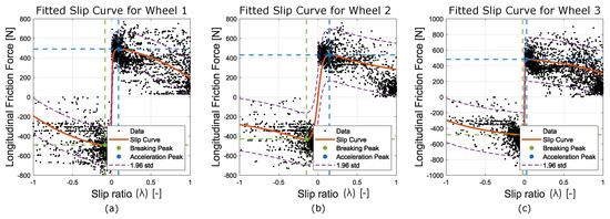 Figure describing the traction relationship with slip for each wheel: (a) wheel 1 traction curve, (b) wheel 2 traction curve, and (c) wheel 3 traction curve. Green and blue dashed lines highlight the intersections of the braking and acceleration peaks, respectively.