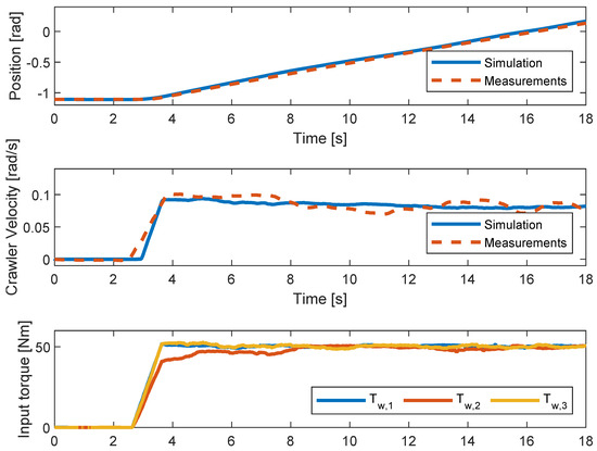 The rotational model is validated using laboratory tests performed on the physical setup seen in Figure 5. The parameters are determined from the physical setup from various tests or the 3D model and then manually tuned to better fit the reality of the combined system. The crawler is actuated using a step input. The measured input torque of the three motors is used as input to the model described in Section 5.2. The angular velocities of the wheel and crawler are measured and compared to the model. The motors are actuated with a step input ranging from 0 to 50 Nm. The crawler is initiated at −1.1 radians since this is the crawler’s equilibrium position. The results of the tests can be seen in Figure 10. The step input is given at 3 s.