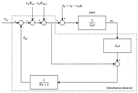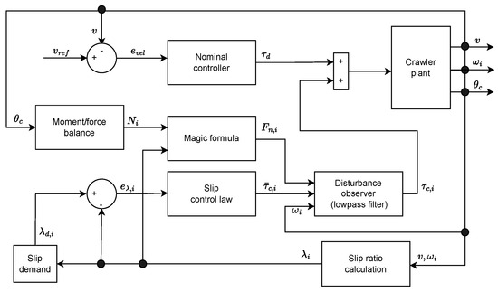 The proposed control scheme has two parts. It consists of a parallel control structure, where one tracks a velocity reference and the other tracks a slip reference. The combined scheme is visualized in Figure 11, with the two controllers being the nominal controller for velocity and the robust slip controller for slip. The slip reference is based on whether the robot is accelerating or decelerating. The required torque is determined by the slip controller to maintain a desired slip ratio. The disturbance observer checks for discrepancies between the nominal and the actual traction force through a lowpass filter. The traction forces are calculated from the magic formula with the normal forces on each wheel found from the system of equations in Section 5.1. A PID controller maintains the system at the reference velocity, outputting the demanded nominal torque, where the slip controller adjusts to avoid slippage. The control structure is similar for all three wheels.