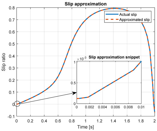 The magic tire formula (MTF) is used to calculate the traction force. The MTF is widely used to describe the wheel and road friction in cars [29,33,35,36]. The equation describing the MTF for each wheel is found in Equation (13).