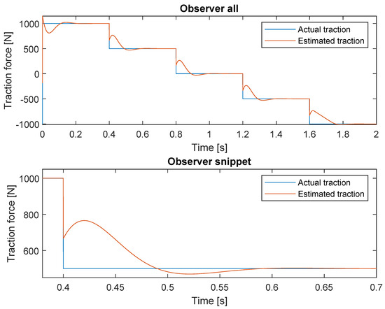 From these tests, it can be seen that there are discrepancies between the top and bottom wheels. This is most significant at wheel pairs one and two. This is caused by a misalignment of the shaft between the wheels. To further investigate whether the model is correct, the forces measured at the individual wheels are summed up into pairs. As seen in the bottom right of Figure 8, the discrepancy between the model and the measured forces is 14.12%, 1.70%, and 9.30% for , , and , respectively. Since friction within the hydraulic actuator is not considered when calculating the piston force, it would be assumed that the simulation would output slightly higher forces than what can be measured at the wheel. The identified offsets between the simulation and measurements are introduced to the model and can be seen in Table 2.