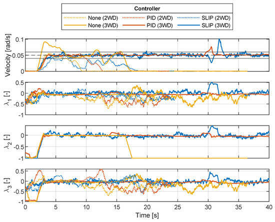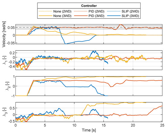 From the figure, it can be deduced that using 3 WD and the slip controller provides the largest range of surface conditions for the robot to operate on. The supervisor is enabled when the slip threshold is crossed at 0.6 s for 3 WD. The supervisor reduces the slip to the demanded slip ratio in order to optimize traction. At this point, the supervisor is disabled at the 0.8 s mark, where surface conditions change to the nominal surface. The PID-only controller case has a slip ratio of and only recovers when the surface traction is increased again.