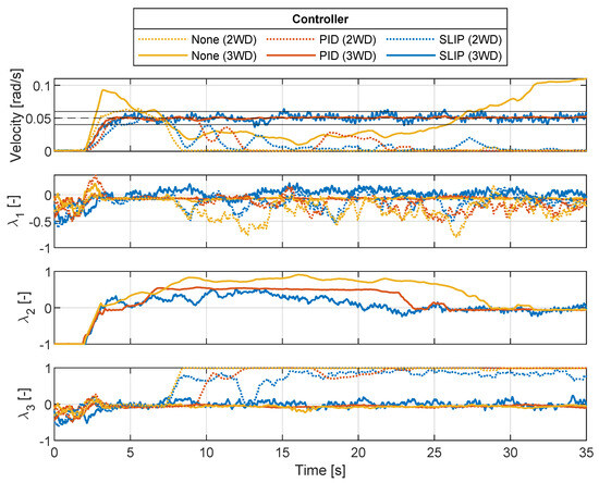 The steady-state characteristics of the sensors were tested, and the results are shown in Table 1. Some noise can be observed in the IMU and TS measurements, while the RIE exhibits negligible steady-state noise. This is expected, as the RIE is a digital rotary encoder that measures discrete increments, making it less sensitive to noise in angular velocity estimation. At a speed reference of 0.05 rad/s, the signal-to-noise ratio of the IMU is 38.4, which is acceptable for the range of speeds used in the experiments. However, at speeds below 0.05 rad/s, sensor noise can have a larger impact on slip estimation, especially if the measured wheel speed fluctuates slightly. Based on the measured variance of the IMU, the corresponding standard deviation is approximately 13 × rad/s. An operating speed of 0.05 rad/s corresponds to a slip estimation variation of ±2.6%, which, in this case, is deemed acceptable.