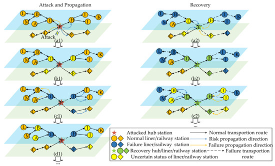 The transportation network studied in this paper consists of two kinds of transportation routes, liner and railway, forming a sea–rail intermodal transportation network. In this paper, the stations are divided into hub stations and non-hub stations according to whether they can support the two modes of transportation. Among them, the hub station can be used as both a liner and railway station, while the non-hub station can only be used as a liner or railway station. In order to illustrate the risk–failure interactive propagation and recovery mechanism in the transportation network, this section takes the attacking hub station as an example, and the specific flow of risk–failure interactive propagation and recovery in the sea–rail intermodal transportation network is shown in Figure 1.