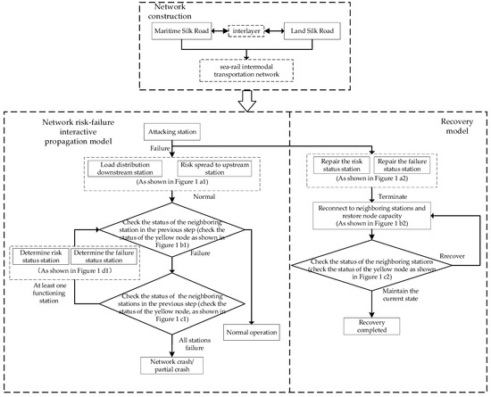 Basic process of risk–failure interactive propagation and recovery in the sea–rail intermodal transportation network. The Maritime Silk Road is the upper transportation network, and the Land Silk Road is the lower transportation network.