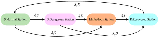 Risk backward propagation model, where ,, , and represent the four states of susceptible, dangerous, infectious, and recovered, respectively, in the risk propagation of the station. represents the rate of transformation of susceptible station into dangerous station , represents the rate of transformation of dangerous station into infectious station , represents the rate of recovery of infectious station , represents the rate of transformation of recovered station into susceptible station , represents the conversion rate of susceptible stations to infectious station , and represents the conversion rate of dangerous station to recovered station .