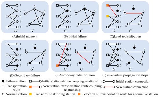 When a network station is attacked, part of the infrastructure may be destroyed to become a failure station. This leads to the risk of backlogs at upstream stations because they cannot continue to transport loads to the failure station. At the same time, the load from the failure station needs to be redistributed to the downstream station, which further increases the transportation pressure and significantly reduces the transportation efficiency, thus triggering the interactive propagation of network risk–failure. In the process, the failure station also needs to take measures to restore network resilience. The above process is called the risk–failure interactive propagation and recovery mechanism of the transportation network.