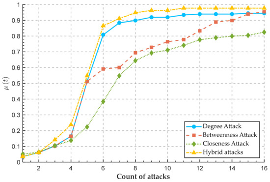 In this attack mode, the network model combines different attack methods to launch a hybrid attack on the stations, in order to more effectively disrupt the structure and function of the transportation network. As the number of attacks increases, different attack modes will act randomly, gradually weakening the overall resilience level of the network. The hybrid attack mode designed in this paper includes three single-attack modes, denoted as ,,and , which are defined as follows: