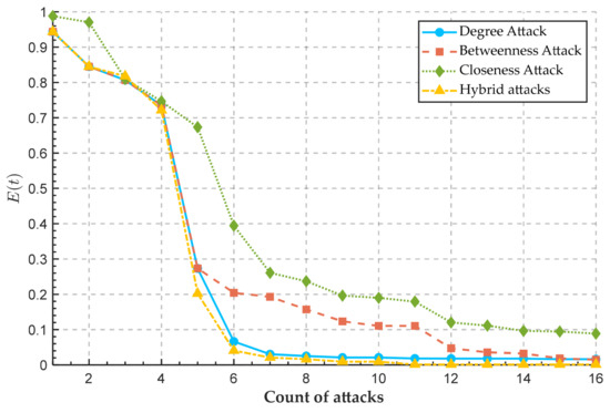 where, when , the attack mode adopts degree attack, and denotes the station degree; when , the attack mode adopts betweenness attack, is the total number of shortest paths from the station to the station , and is the number of shortest paths through the station ; when , the attack mode adopts closeness attack, where is the length of the shortest path from the station to the station .