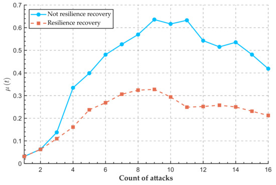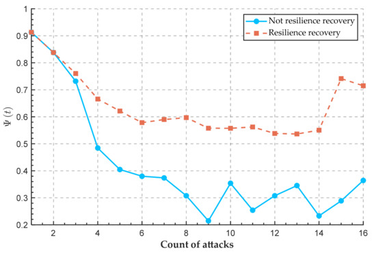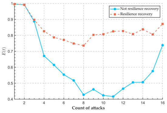 The risk recovery rate serves as a key indicator for measuring port resilience, reflecting a port’s capability to restore normal operations from risk-exposed conditions. This metric demonstrates a positive correlation with a port’s risk management capacity. The stronger the management capability, the higher the risk recovery rate. Taking Phase 1 of Singapore’s Tuas Port as an example, the implementation of an AI-driven intelligent monitoring system has enabled real-time dynamic management of terminal safety and traffic coordination, significantly enhancing risk response efficiency. This AI-powered risk management advancement not only ensures operational stability at Tuas Port but also substantially strengthens the systemic resilience of the entire transportation network. Simulation analysis examining the impact of varying risk recovery rates, , on network resilience is presented in Figure 15, Figure 16 and Figure 17.