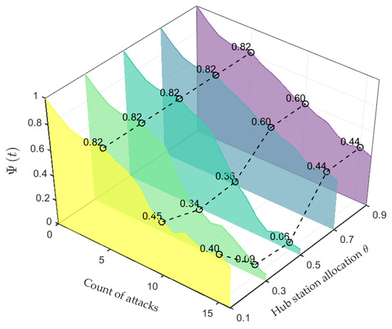 The Red Sea crisis in January 2024 led to the closure of affected ports, forcing shipping companies to dynamically reroute cargo to alternative ports or adjust shipping lanes (e.g., many opted to reroute around the Cape of Good Hope in Africa instead of the Red Sea). This resulted in severe congestion at other ports, such as the Port of Durban, due to sudden route adjustments, causing a decline in global shipping network efficiency and a surge in freight costs. Implementing efficient dynamic cargo allocation, strengthening regional collaboration, and enhancing policy guidance can help build a more resilient and cost-controllable global shipping network. The effectiveness of distributional balancing at hub stations highly relies on the capacity ratio threshold settings. Examining how sea–rail intermodal transportation network resilience is affected by the proportion of residual or total capacity in the load-balancing strategy at the hub station determines the different load allocation rules denoted by the parameters . To investigate the network resilience of the balancing strategy adjustment, the simulation results are shown in Figure 18, Figure 19 and Figure 20, where the range of is from 0.1 to 0.9, with an incremental step of 0.2.