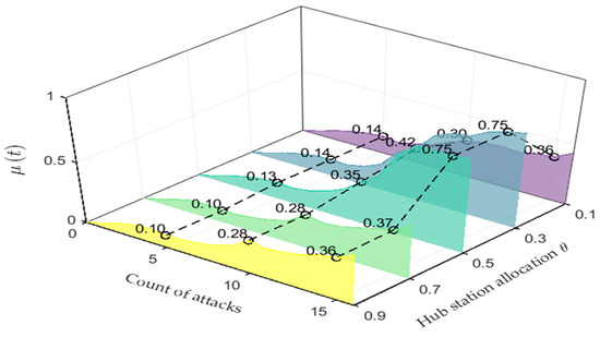 The simulation results in Figure 12, Figure 13 and Figure 14 systematically evaluate the relationship between station repair time and the resilience recovery dynamics of sea–rail intermodal transportation networks under the hybrid attack scenario. As shown in Figure 12 and Figure 13, the shortening of the station repair time weakened the interdependence between stations, and the minimum of and gradually increased. As shown in Figure 14, when , the evolution trend of was similar. It can be seen that when the repair time was shortened, the increase in the station repair time made the minimum of show a more obvious decreasing trend, and the corresponding network failure rate peaked into a rising trend.