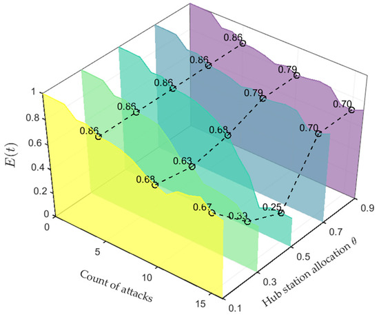 Combining Figure 18, Figure 19 and Figure 20, the simulation results indicated that under the balanced configuration strategy , network connectivity and efficiency decreased by 38% and 45%, respectively, while the failure rate increased to 34%. Compared to a balancing strategy that prioritizes total capacity, when the load distribution strategy shifted toward residual capacity , the network connectivity and efficiency improved by 15% and 11%, respectively, at an attack count of 10, but the failure rate also increased by 2%. This phenomenon indicated that although the balanced configuration attempted to achieve global optimization by balancing the weights of residual capacity and total capacity, it failed to adequately differentiate the distinct resource endowments of high-capacity stations. As a result, the potential processing capacity of critical stations was not effectively released, while low-capacity stations experienced resource waste due to redundant load distribution, leading to a collapse in efficiency.