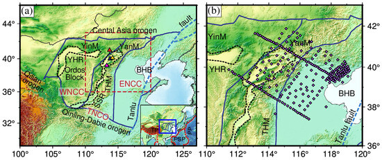(a) Topographic map of the North China Craton (NCC) and adjacent areas. The red rectangle shows the present study region. Triangles show the distribution of Cenozoic basalts (red: Jining, Miocene; green: Hannuoba, Miocene; blue: Datong, Quaternary; yellow: Yangyuan, Oligocene; purple: Fanshi, Oligocene) [22,23]. Blue solid lines show the NCC boundaries. Blue and black dashed lines mark the Tanlu fault and rifts, respectively. Black solid line indicates the coastline. Abbreviations of rifts: SSR: Shanxi–Shaanxi Rift; YHR: Yinchuan–Hetao Rift. Abbreviations of mountains: THM: Taihang Mountains; YanM: Yan Mountains; YinM: Yin Mountains. BHB: Bohai Bay; ENCC: eastern NCC; TNCO: Trans-North China Orogen; WNCC: western NCC. In the inset map, blue rectangle shows the region of (a), and the red solid lines (with triangles) denote the major plate boundaries. IP: India Plate; PSP: Philippine Sea Plate; PP: Pacific Plate; TP: Tibetan Plateau (b) Distribution of seismic stations (lilac-colored rhombuses) used in this study.