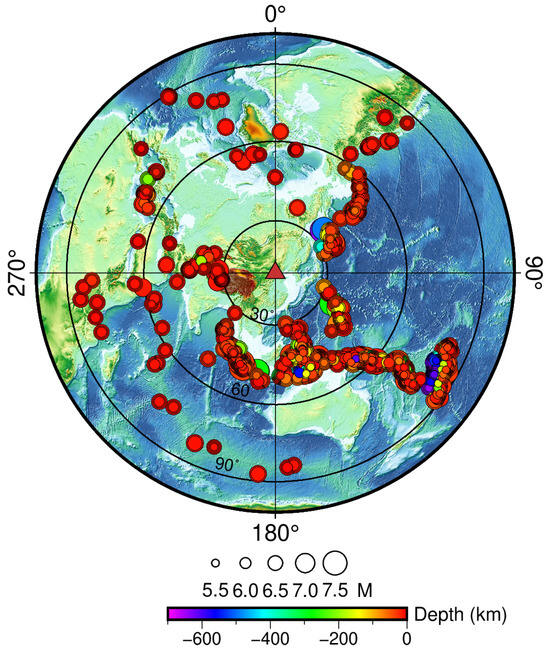 In this study, we used teleseismic data recorded by the dense temporary North China Seismic Array (Figure 1b). This array was deployed by the Institute of Geophysics, China Earthquake Administration, from October 2006 to March 2009. It comprised 250 seismic stations in total, including 190 broadband stations (equipped with Guralp CMG-3ESPC sensor and Refteck130B recorder, frequency bandwidth: 0.02–60 s), 10 very broadband stations (equipped with Guralp CMG-3T sensor and Refteck130B recorder, frequency bandwidth: 0.02–120 s), and 50 short-period stations. The station spacing is 10 km along the two primary linear profiles and around Tangshan City, and 35 km in other regions. We selected 727 earthquakes (Figure 2) with magnitudes greater than 5.5, epicentral distances between 30° and 90°, and recorded by more than 10 seismic stations in the study region. These events provided excellent azimuthal coverage (Figure 2). Relative travel-time residuals were obtained by applying the Multiple Channel Cross Correlation (MCCC) method [27] to high-quality teleseismic waveform data filtered with a 0.4–1.5 Hz bandpass. We used the IASP91 model [28] as the 1-D reference model and set a cross-correlation coefficient threshold of 0.83 to ensure the selection of high-quality relative delay times. Finally, 50,549 delay times were selected to invert the 3-D velocity structure beneath the study area.