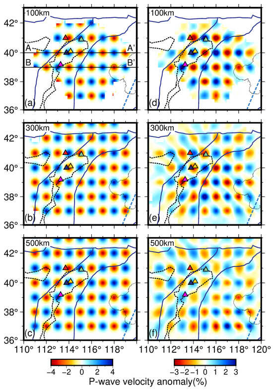 Checkerboard resolution tests for P-wave model. (a–c) Depth slices of the input checkerboard model at 100, 300, and 500 km depth, respectively. Gaussian spheres with a 50 km radius and ±4% peak velocity anomaly are distributed in layers of 100, 300 and 500 km depth. (d–f) The retrieved checkerboard model at 100, 300, and 500 km depth, respectively. Blue solid lines show the NCC boundaries. Blue and black dashed lines mark the Tanlu fault and rifts, respectively. Colored triangles show the distribution of Cenozoic basalts (Figure 1).