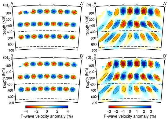 (a,b) Cross sections of the input checkerboard model along profiles A–A’ and B–B’. (c,d) Cross sections of the retrieved checkerboard model along profiles A–A’ and B–B’. Black dashed lines mark the locations of 410 km and 660 km discontinuities.
